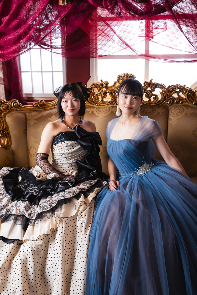 千葉市美浜区のフォトスタジオ「卒業袴館幕張本店」のドレス姿のお嬢さまたちのお写真です。卒業式衣装レンタルのお支度の前撮りとしてご来店いただきました。