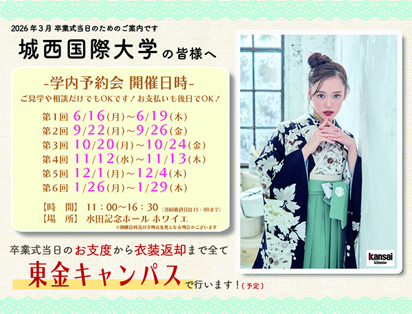 2026/01/02 【城西国際大学】学内予約会終了いたしました! お近くの店舗にて受付いたします! お知らせ 幕張本店 COLLEGE 城西国際大学 試着や予約が簡単にできる 便利な学内予約会を開催! 城西国際大学だけの提携校特別割引を行っています! さらに!レンタルパックお申込みの方はゆったり前撮りが無料で出来ます!! プラン内容はお気軽にお問い合わせください!絶対お得です!! 卒業袴館 幕張本店 📞 043-307-8377 \ 学内予約会に参加できない方は、各店舗でも見学・ご予約OK! / 近くの店舗を探す 該当店舗 幕張本店